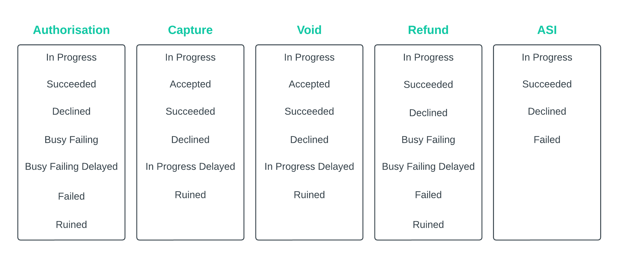 | Declined | Authorisation Refund | The operation request was declined by the issuer. For Authorisation, Refund and ASI, it means your request has been declined by the issuer or the card scheme. You may check the decline responseCode property for the decline reason and act accordingly.Even though it is technically possible for a Capture or Void to be declined, these are treated as exceptional cases and the outcome is set as "Ruined" for those scenarios. |
