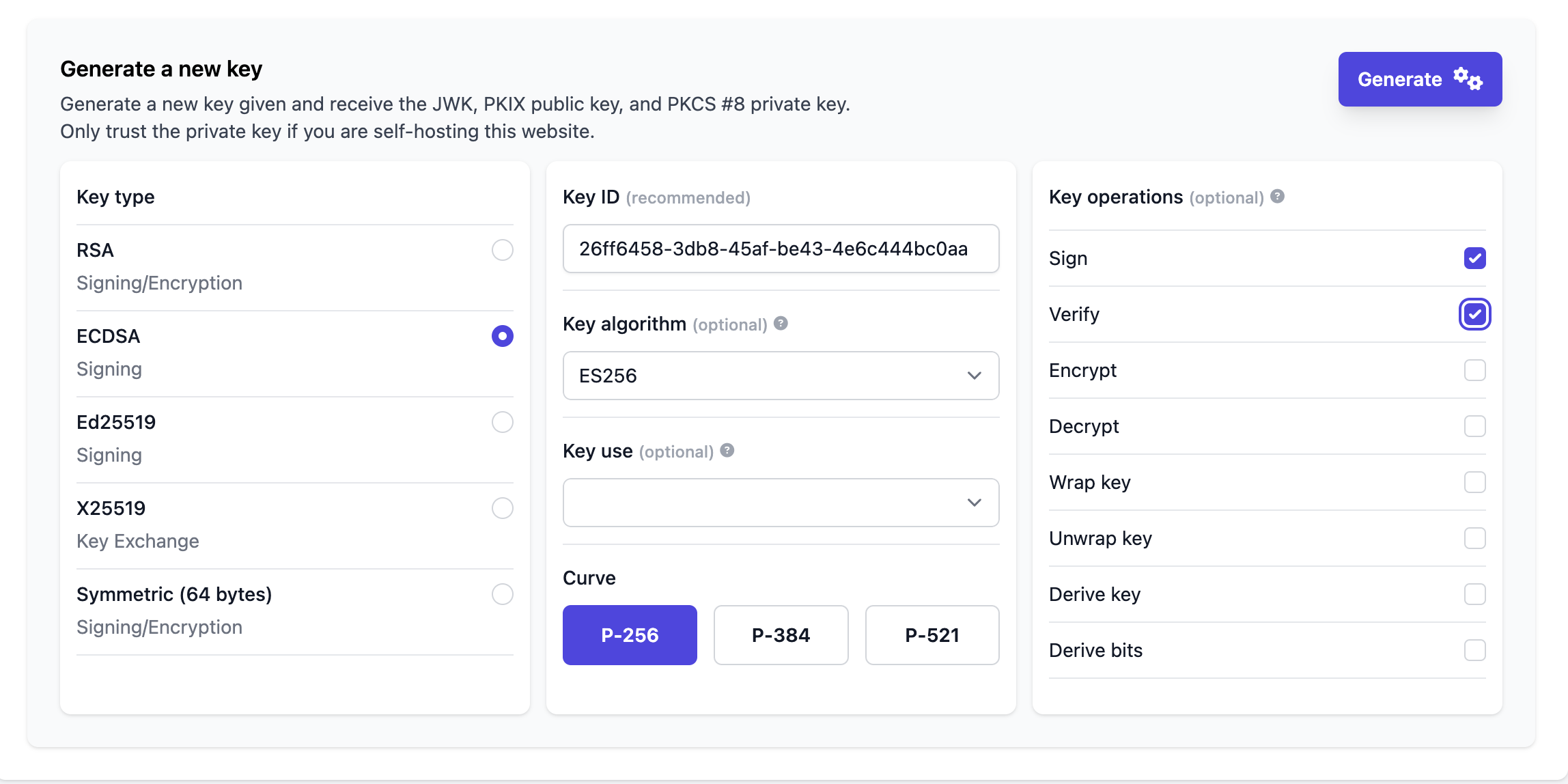 To begin, you will need to generate a private-public key pair using the ES256 algorithm. You can use either of the approaches listed below to generate your keys.